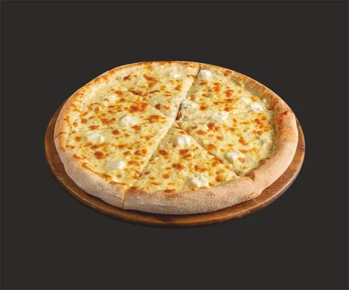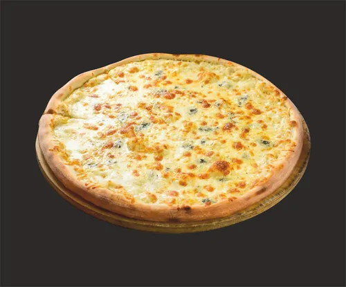 Пицца на тонком тесте, сливочном соусе, с сыром моцарелла, пармезаном, эмминталь, горгонзола.