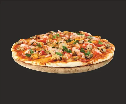 Пицца на тонком тесте, сливочном соусе, с сыром моцарелла, креветками, кальмаром и цукини.