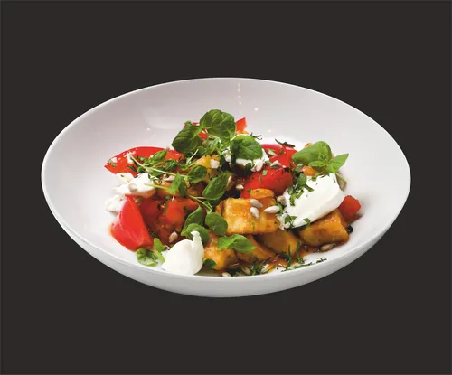 Баклажаны, салат " Фриллис ", руккола , помидоры черри , творожный сыр , заправка.