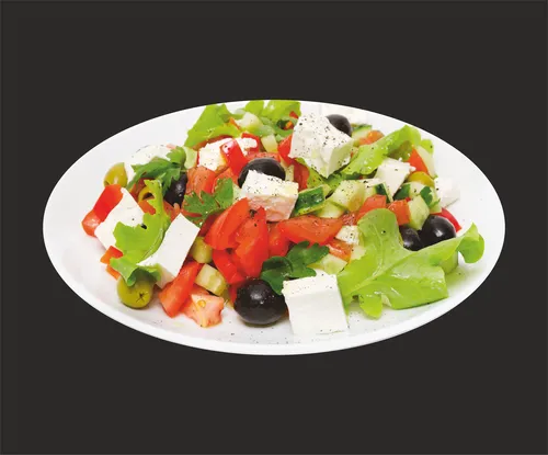 Лист салата Фриллис, огурец, помидор черри, перец болгарский, маслины, сыр фета, масло оливковое, заправка