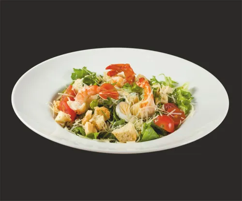 Лист салата " Фриллис ", помидор черри , креветки , сухари , заправка " Цезарь ".