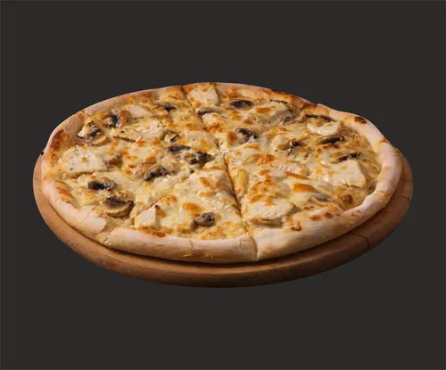 Пицца на тонком тесте, сливочном соусе , с сыром моцарелла , куриным филе , грибами и трюфельным маслом.