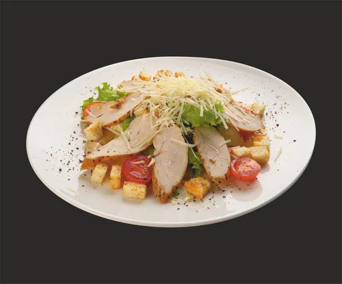 Лист салата " Фриллис ", помидор черри , куриная грудка , сухари , заправка " Цезарь ".