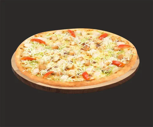 Пицца на тонком тесте с куриным филе, листом салата, помидорами черри, соусом «Цезарь».