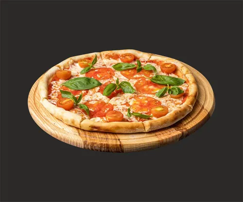 Пицца на тонком тесте, красном соусе , с сыром моцарелла , томатами черри.
