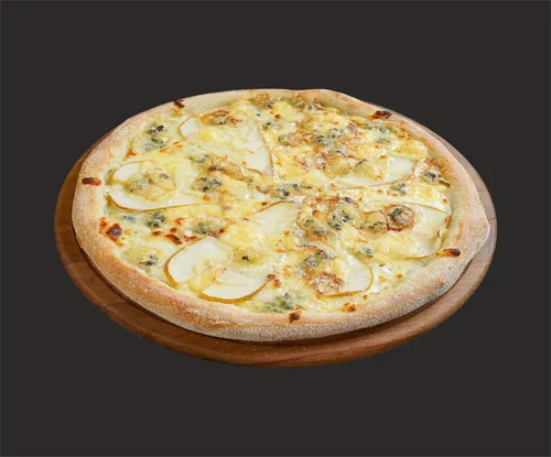 Пицца на тонком тесте, сливочном соусе, с сыром моцарелла, пармезаном, эмминталь, горгонзола, груша "конференция".